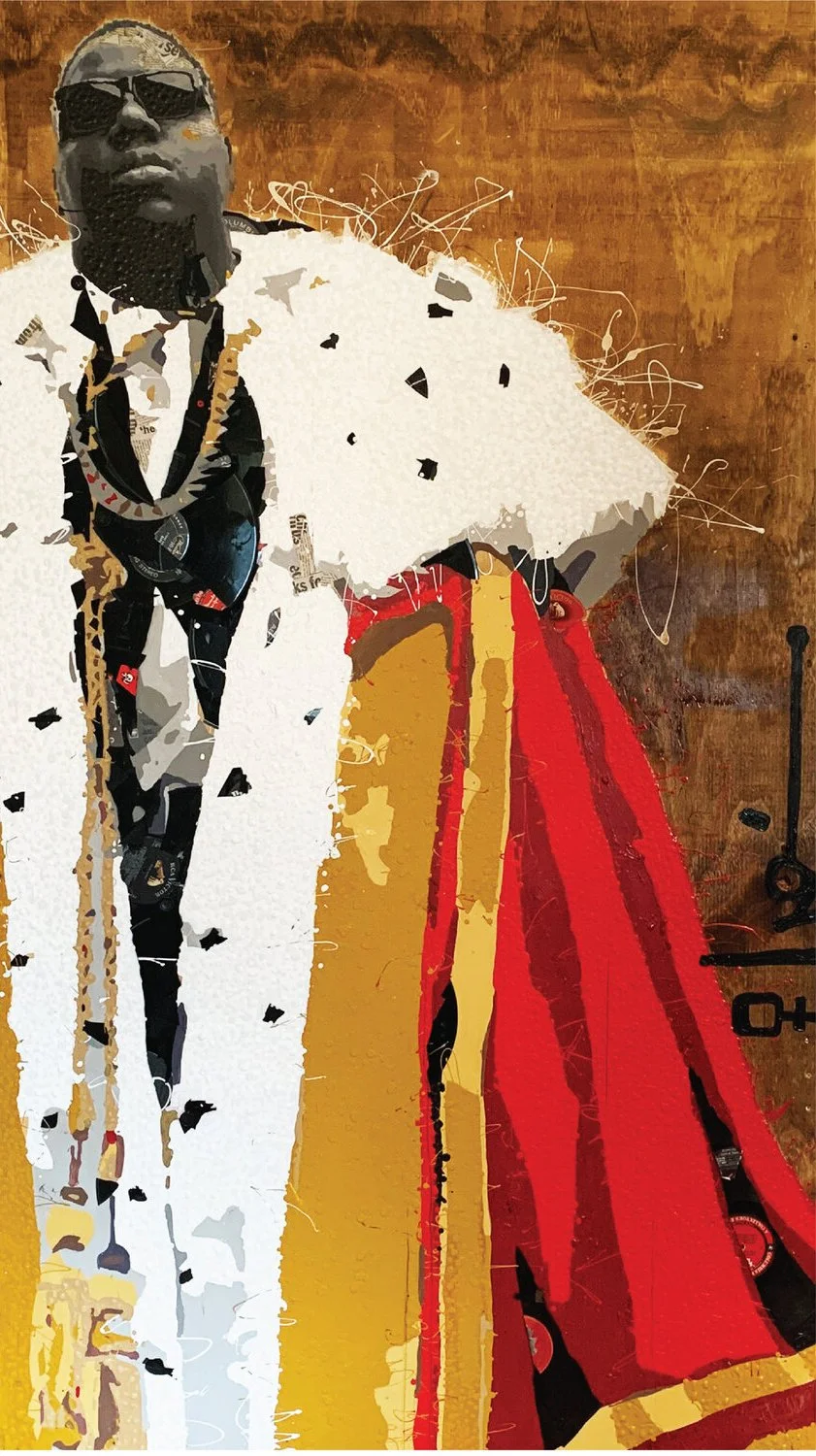 Title: King Big / Medium: Multi-Media / Materials: Vinyl, Paper, Acrylic Paint. On Wood